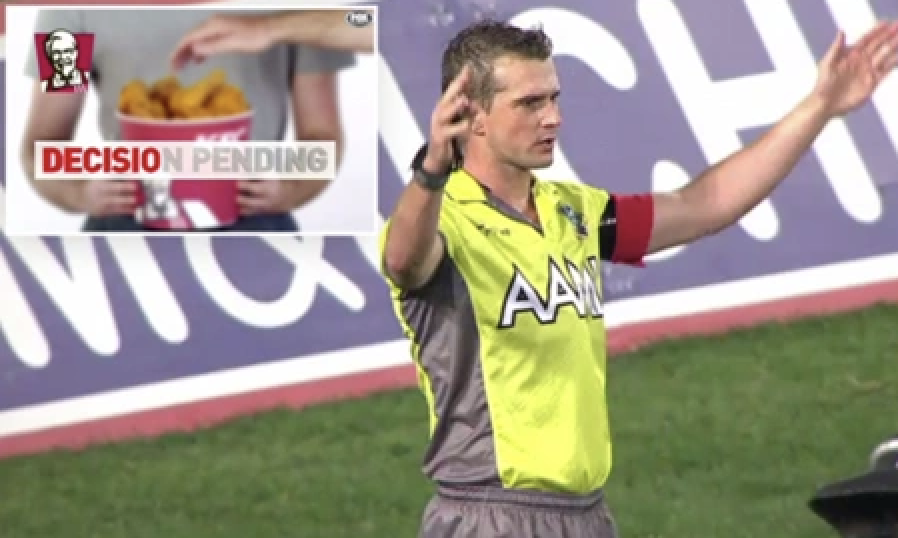Have you ever noticed KFC’s brand placement at an NRL game? I think their most iconic ad is played when a try is scored and the big screen shows a video of someone going to grab a piece of chicken.